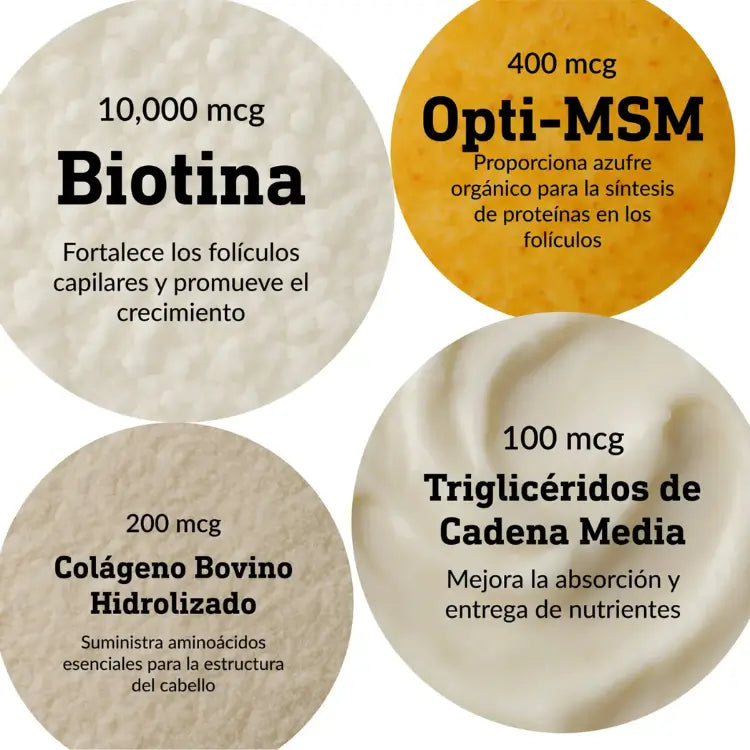 Nuestra combinación única de biotina (10,000 mcg), colágeno (200 mg) y Opti-MSM (400 mg) ataca las causas fundamentales de la pérdida de cabello femenino, de manera en que otros suplementos con un solo ingrediente no pueden.